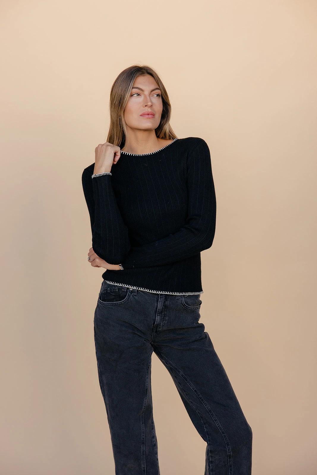 Tired of basic layers that lack personality? This black ribbed long sleeve is designed to bridge the gap between comfort and edgy style. Featuring a sleek textured knit and bold white contrast stitching, this top adds an instant modern aesthetic to any outfit, making it the perfect solution for effortless day-to-night transitions.