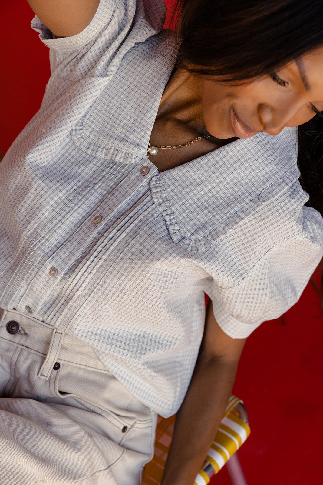 Upgrade your style with a piece that perfectly balances vintage charm and contemporary flair. This blue gingham blouse is the ultimate solution for those looking to add a feminine, standout touch to their daily rotation while maintaining a sophisticated edge.