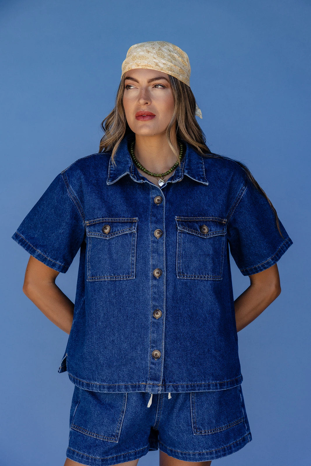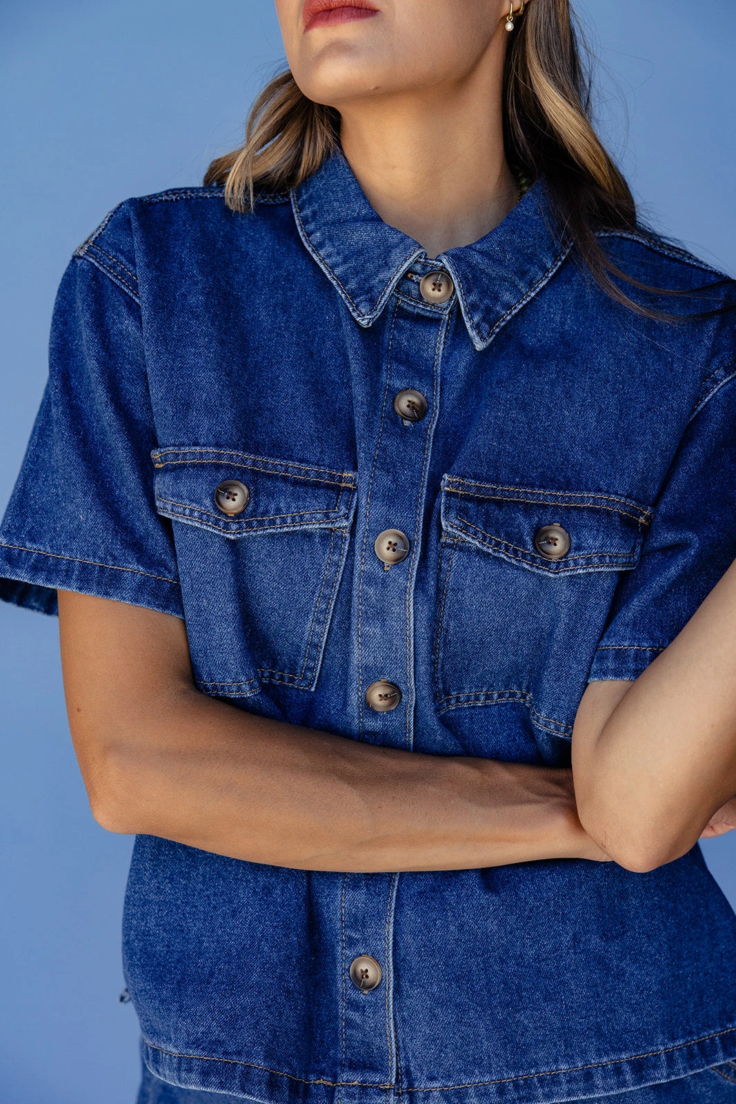 This button-up denim blouse features a boxy, relaxed fit and front patch pockets for a casual yet structured look. With its classic collar and versatile wash, it’s an effortless staple you’ll reach for again and again.
