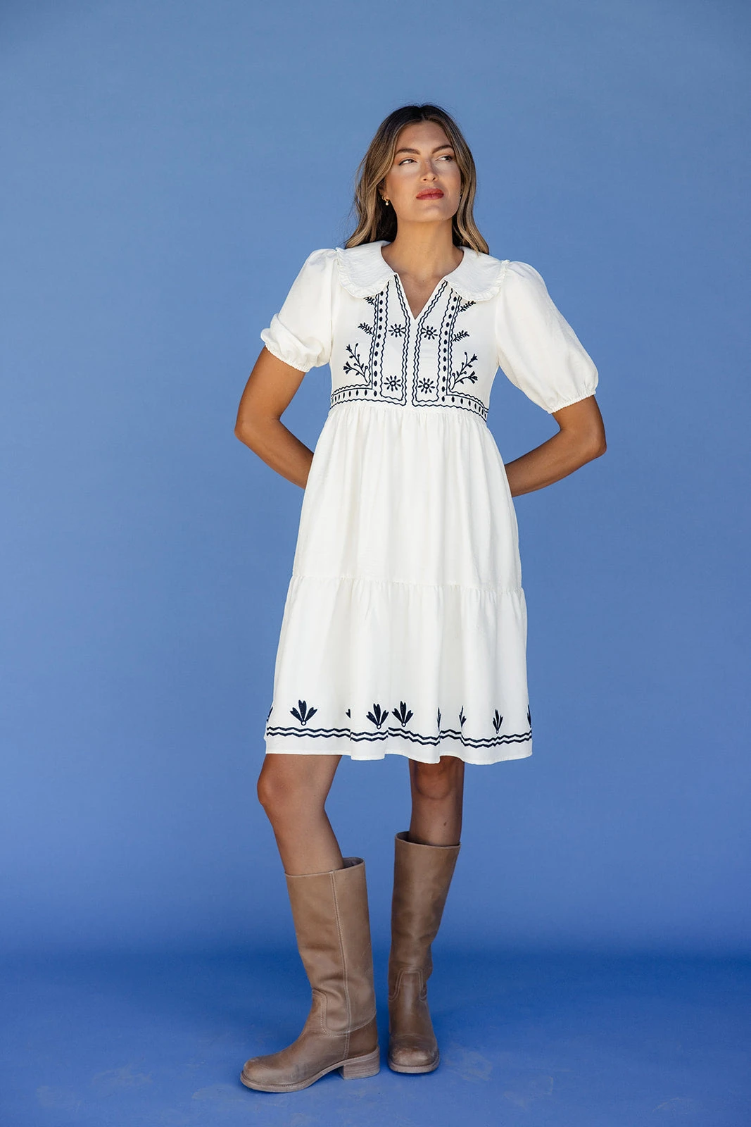 - Exquisite Embroidery: Features intricate navy embroidery along the bodice and hem for a high-end, artisanal finish.