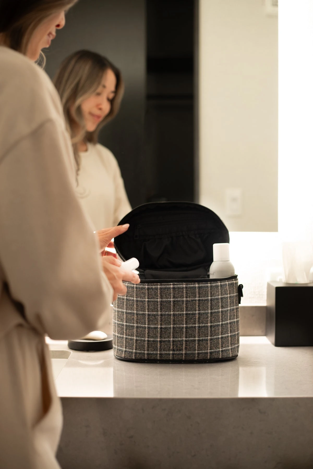Elevate your beauty routine with the Fawn Train Case in Plaid Tweed. Designed for the stylish traveler, this sleek zip-around case combines the timeless texture of woven tweed with modern matte black accents. Whether you are packing skincare, haircare, or daily makeup essentials, this versatile organizer ensures everything stays perfectly in place from home to hotel.