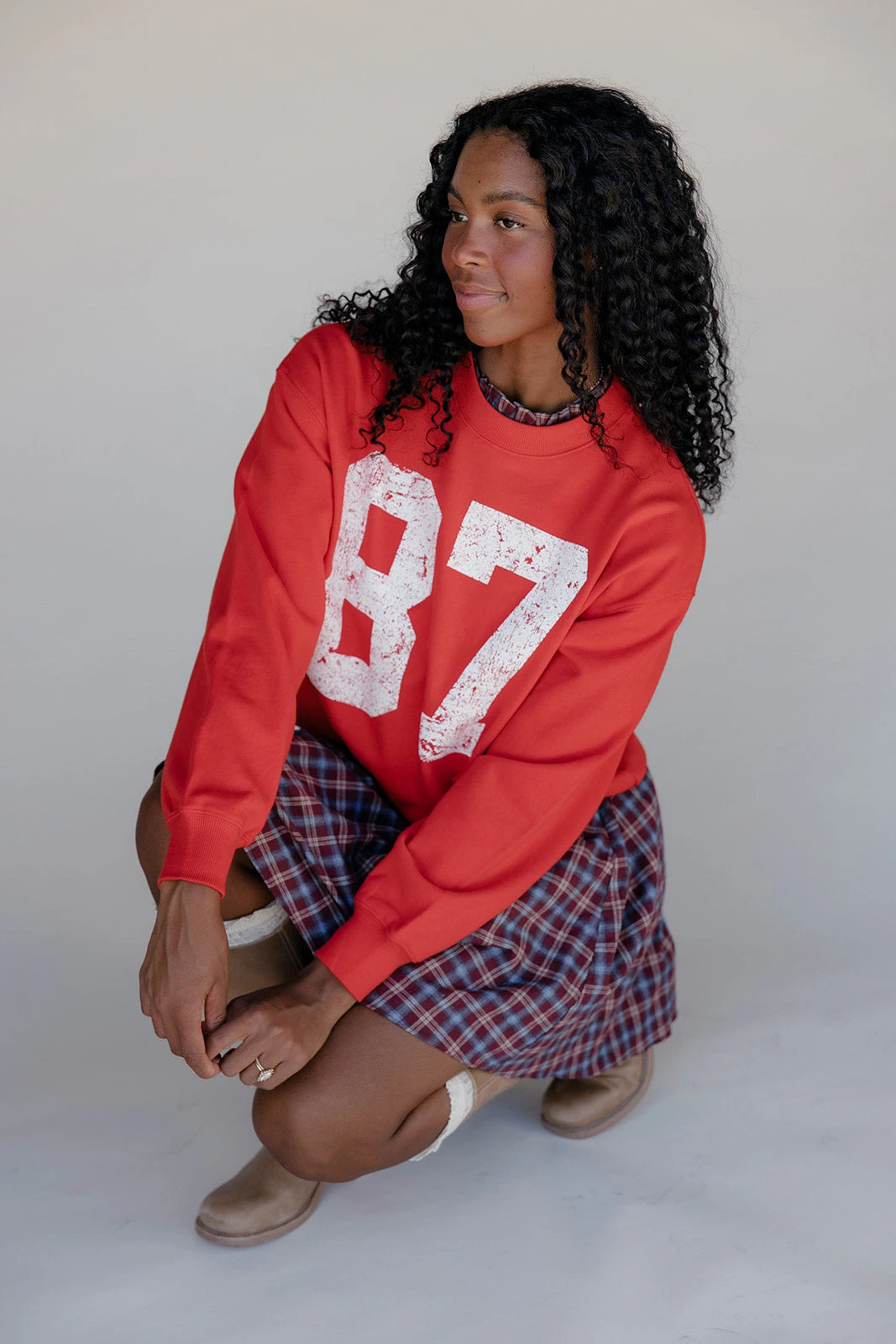 A bold red pullover sweatshirt with a vintage-inspired white “87” graphic across the chest. Perfect for casual game-day vibes with a sporty, retro touch.