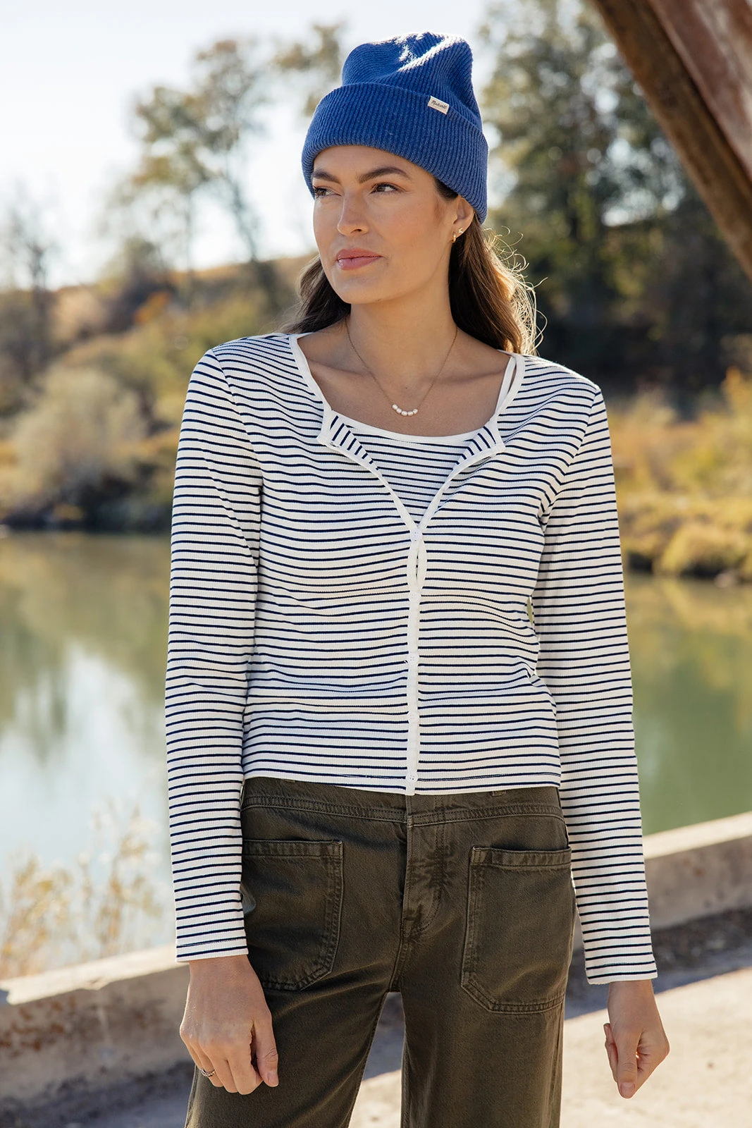 What a fun top option! The Jeanne Stripe Tank + Cardigan comes with a spaghetti strap tank and a simple button-front cardigan. Featuring ribbed material and white piping, this top is versatile and easy to pair with just about anything!