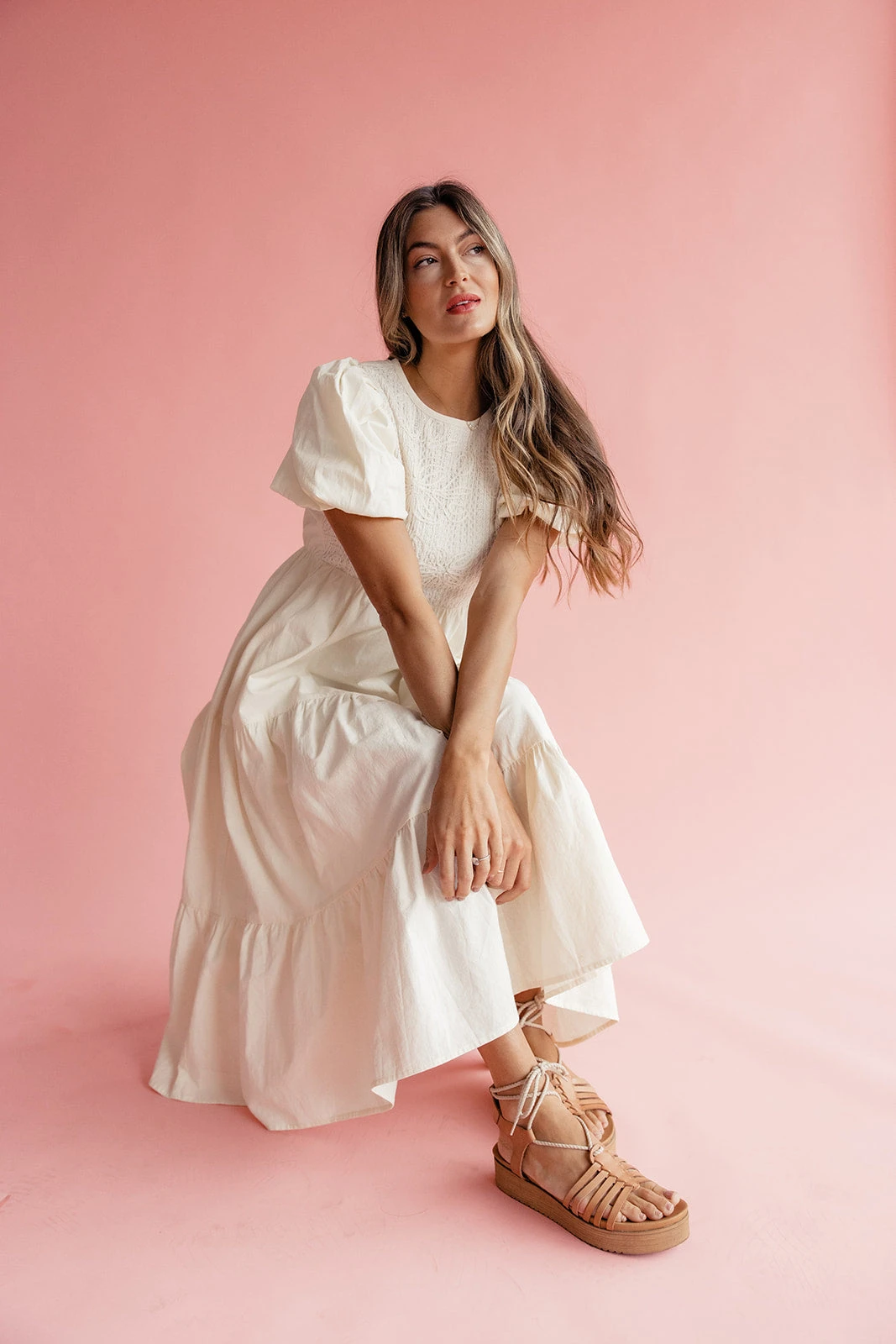 Radiate effortless elegance in this dreamy midi. Featuring a delicately textured bodice with subtle embroidery and voluminous puff sleeves, this dress blends romance with timeless charm. The tiered skirt flows gracefully for a flattering silhouette, while the soft, lightweight fabric makes it perfect for warm days and special occasions alike.