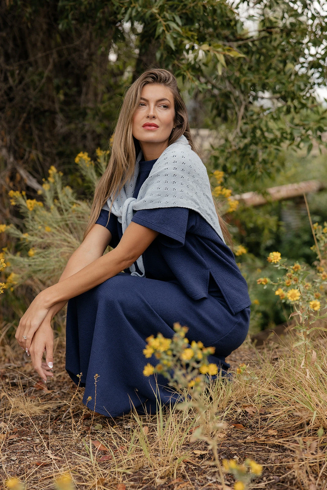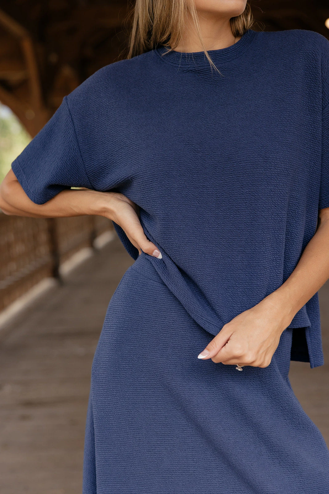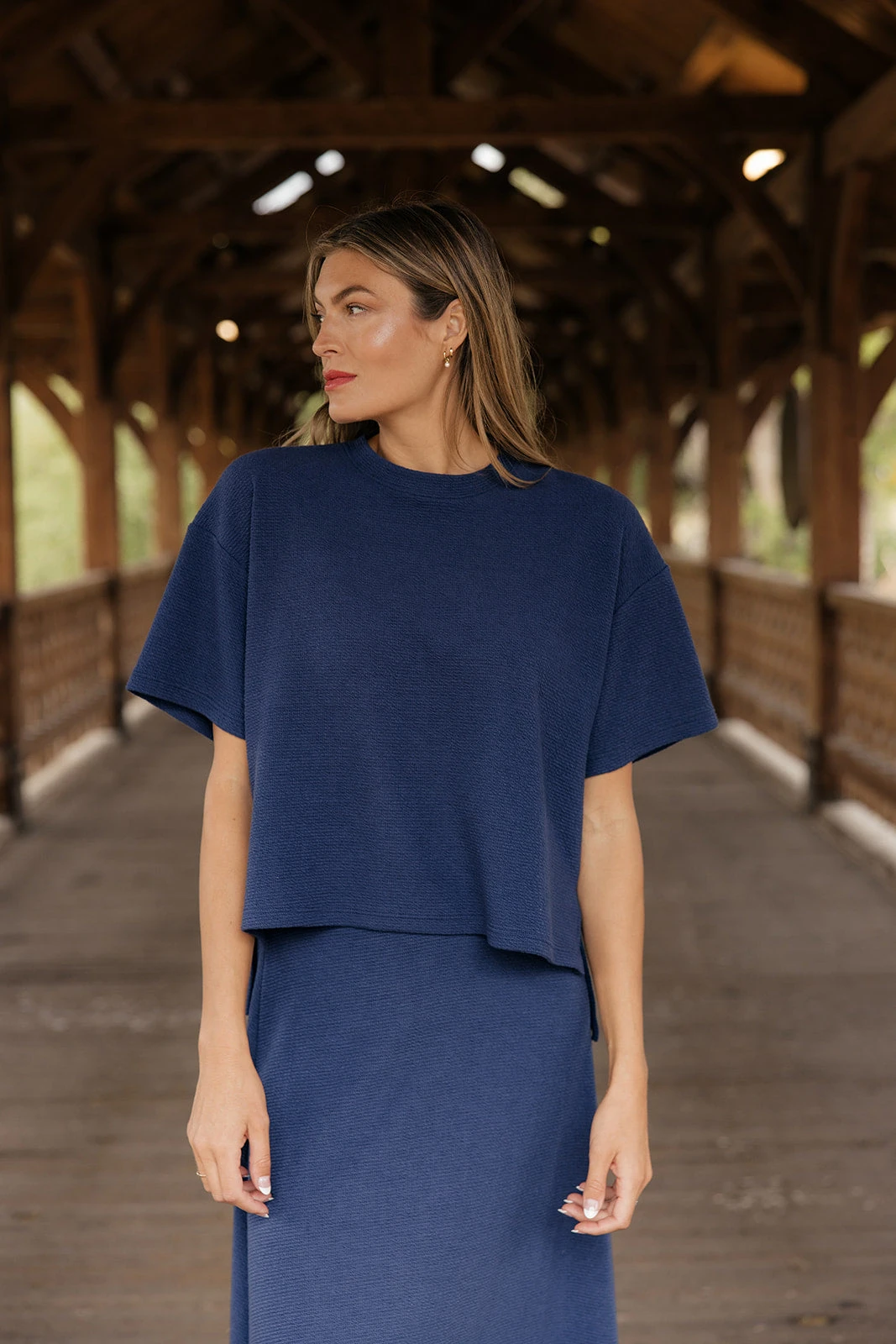 Sleek, versatile, and modern—this boxy navy tee is an easy pick for both lounging and layering. Pair it with the matching skirt for a head-to-toe moment or wear it with denim for a cool casual look.