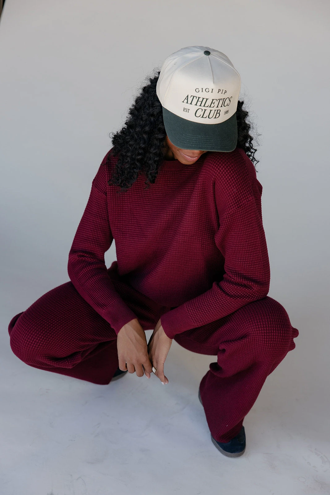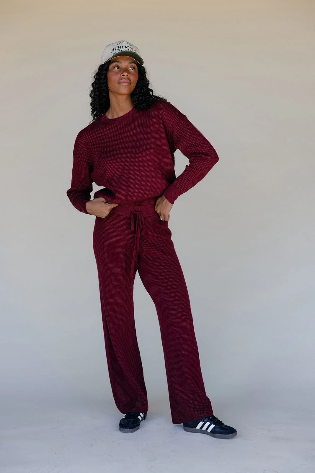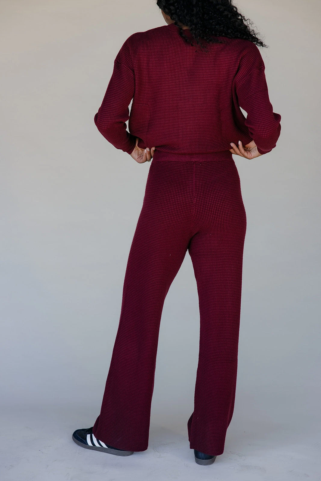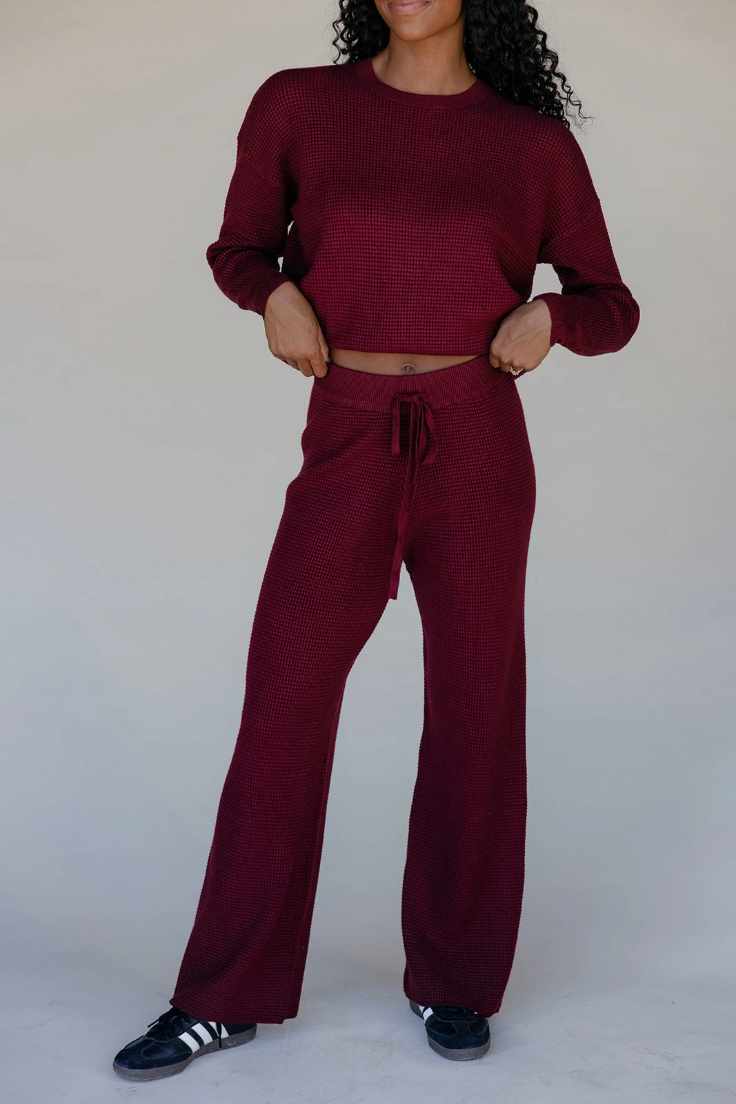 Cozy ribbed wide-leg pants in a rich brown tone, designed with a drawstring waist for all-day ease.