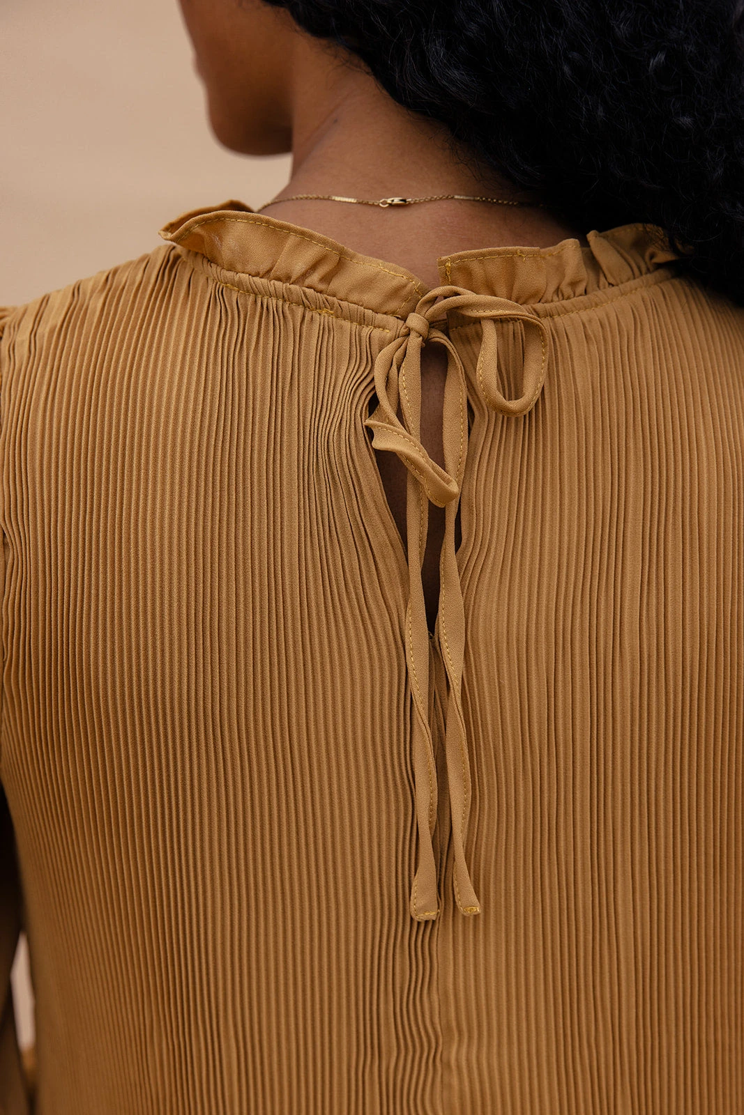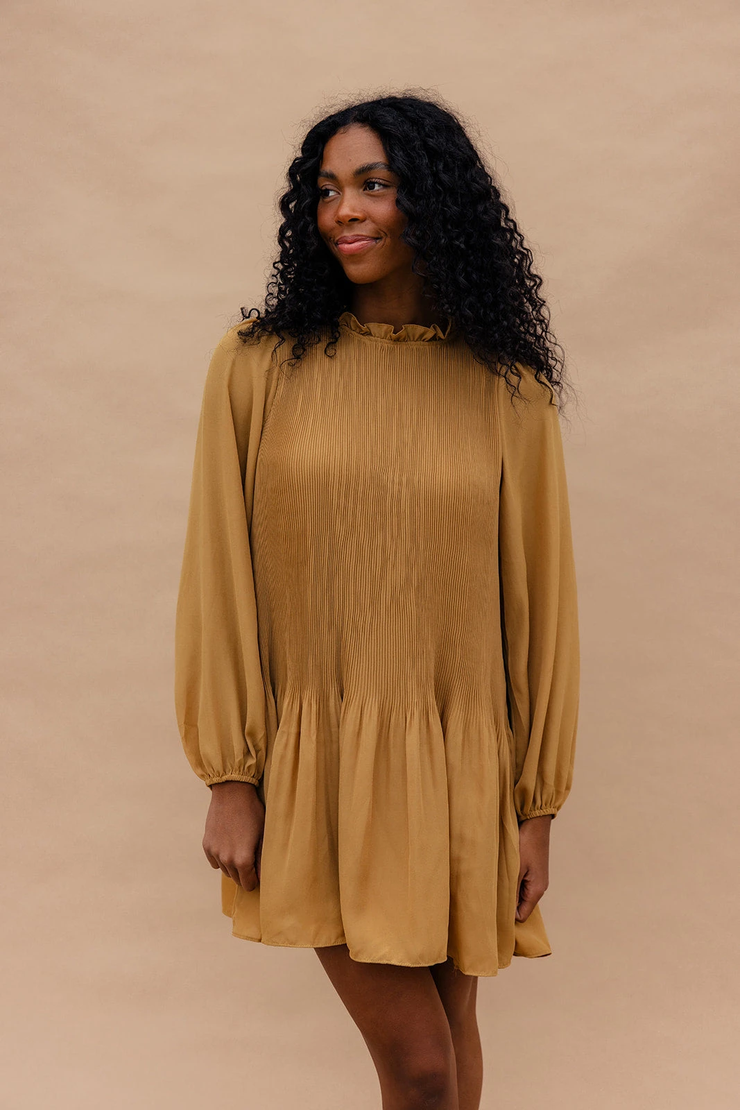 This fun and flirty mini dress features a pleated bodice and functional tie on the back of the neck for easy on and off. The Getaway Ruffle Neck Dress is a fun twist on the classic Holiday dress!