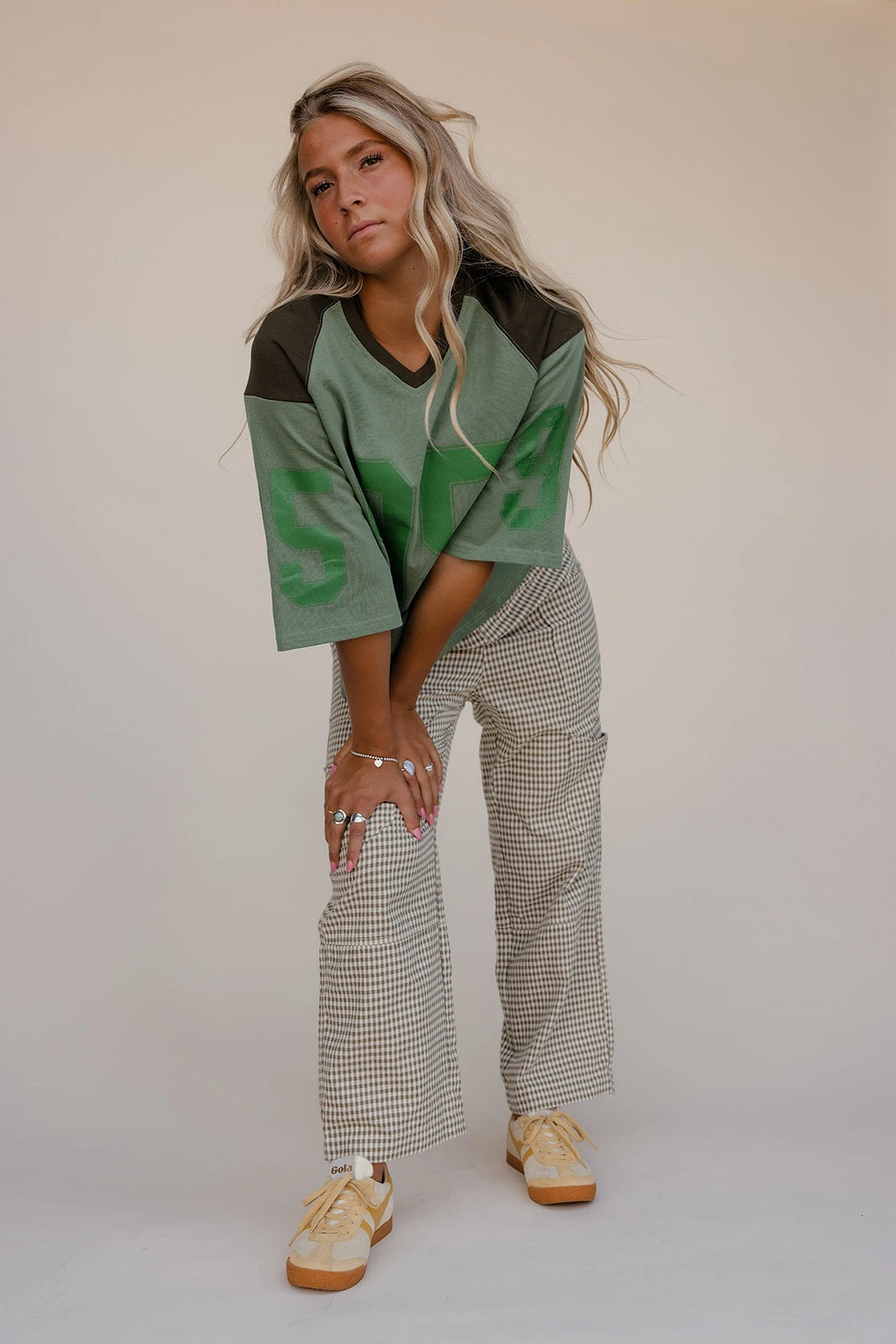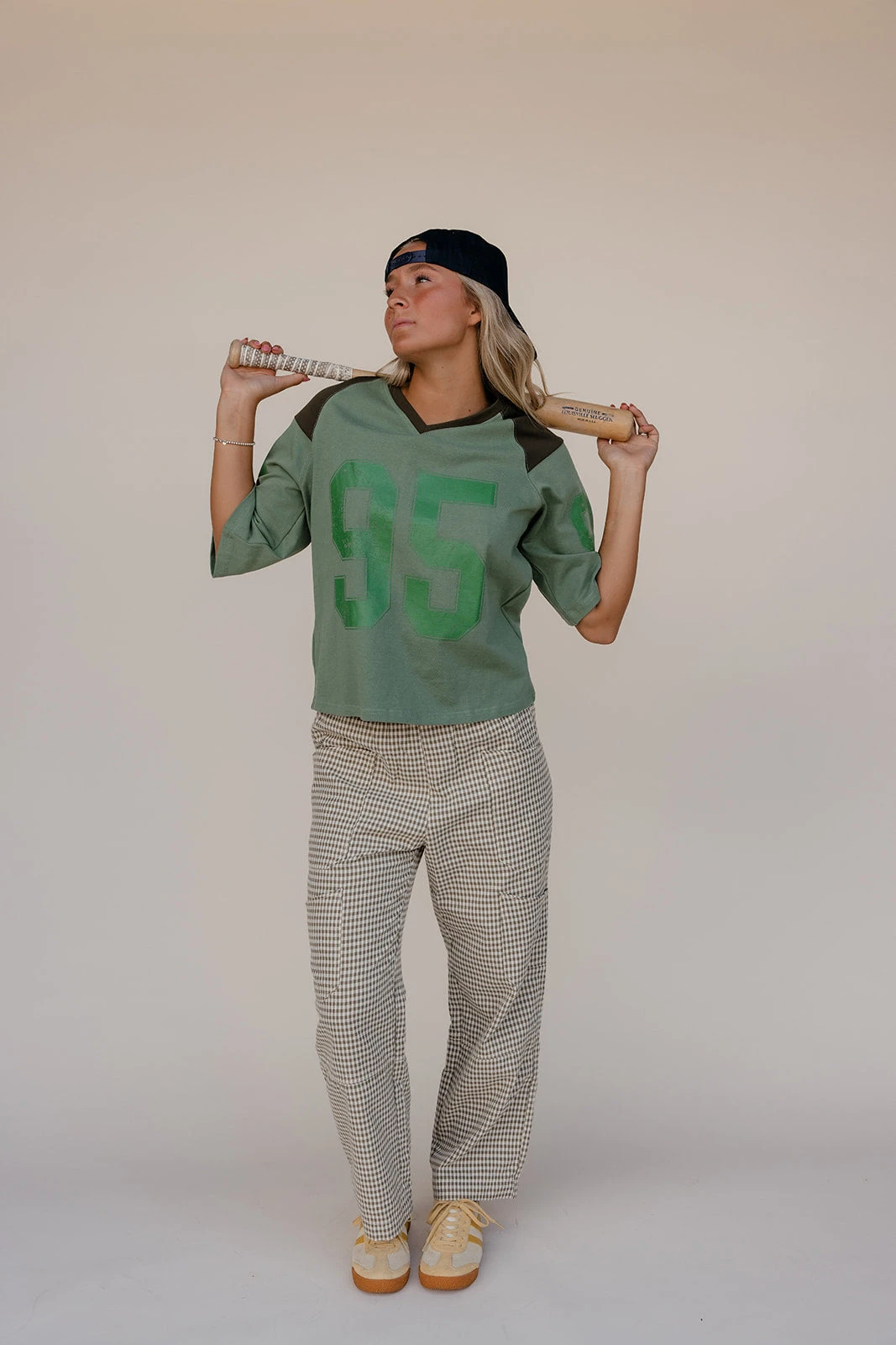 Channel your inner cool girl in this sporty green v-neck tee, featuring bold “95” lettering that screams spirit week every week.